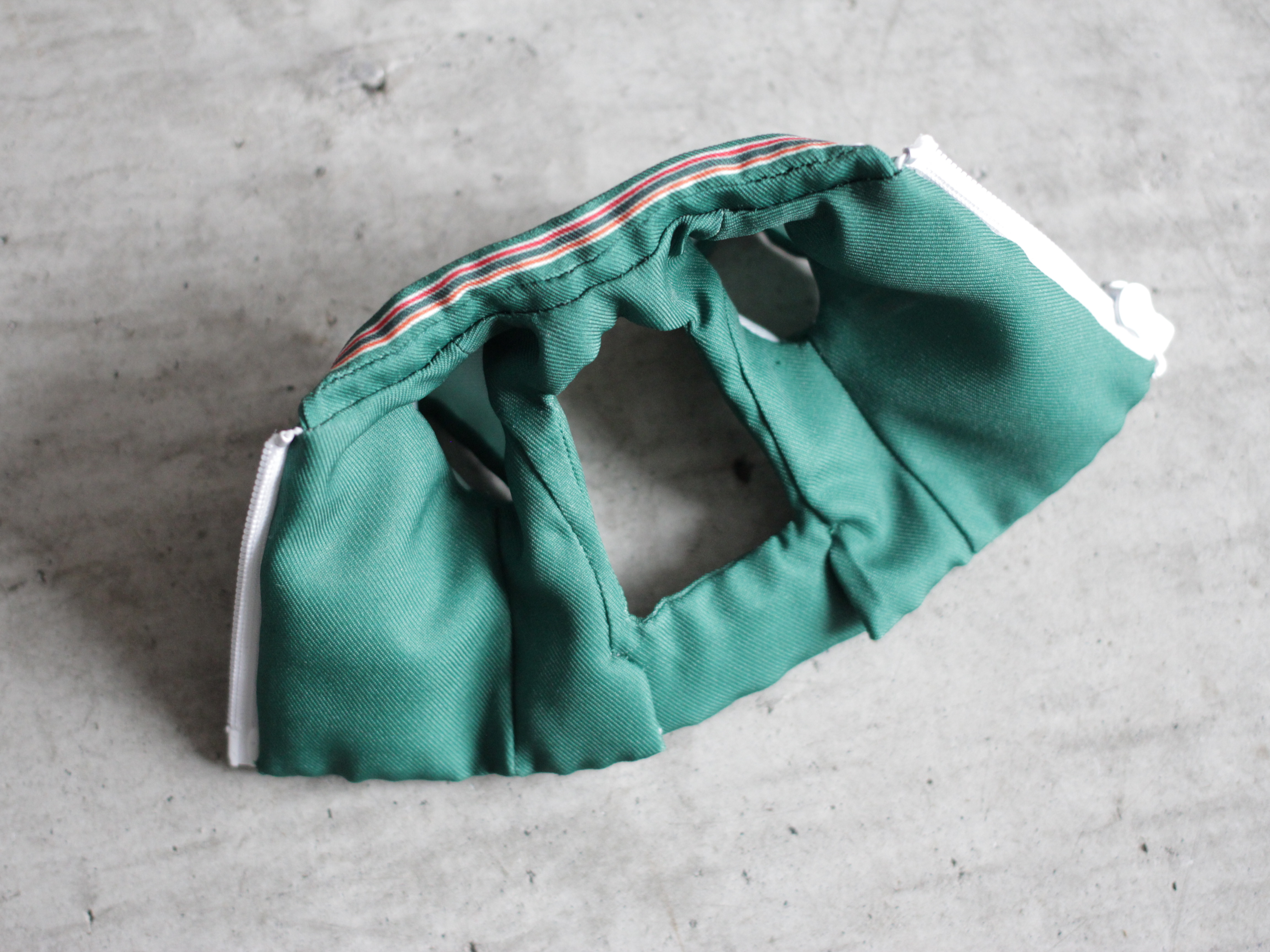 生地は特注でプリント。2mmほどの2つ穴ボタンも特注しています。